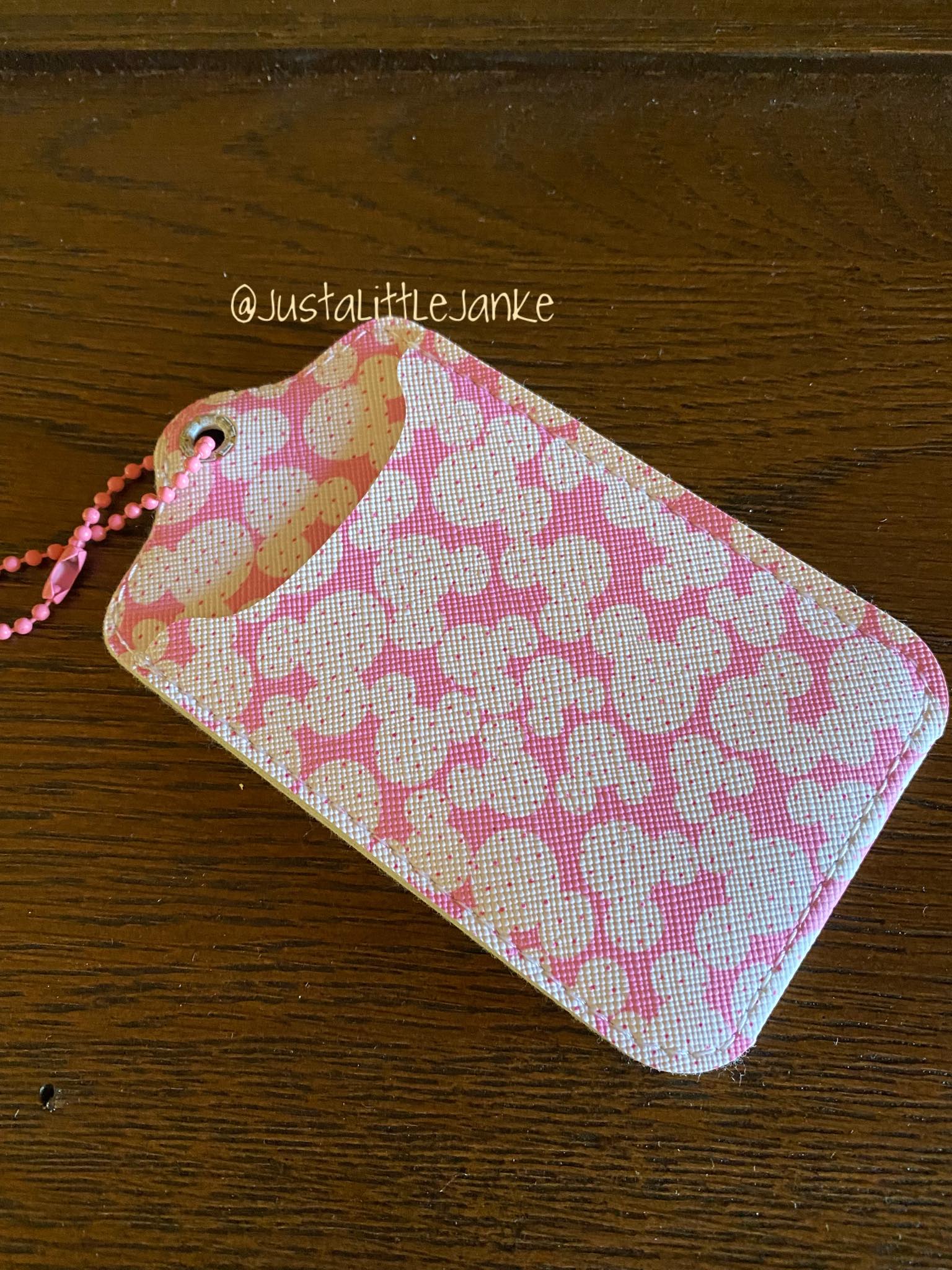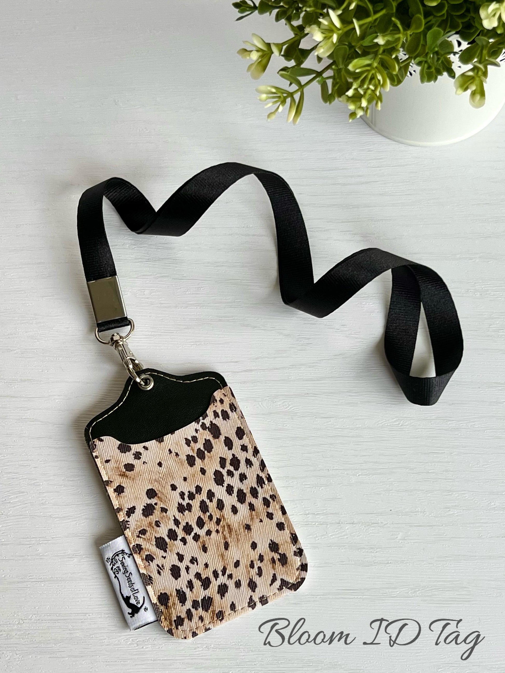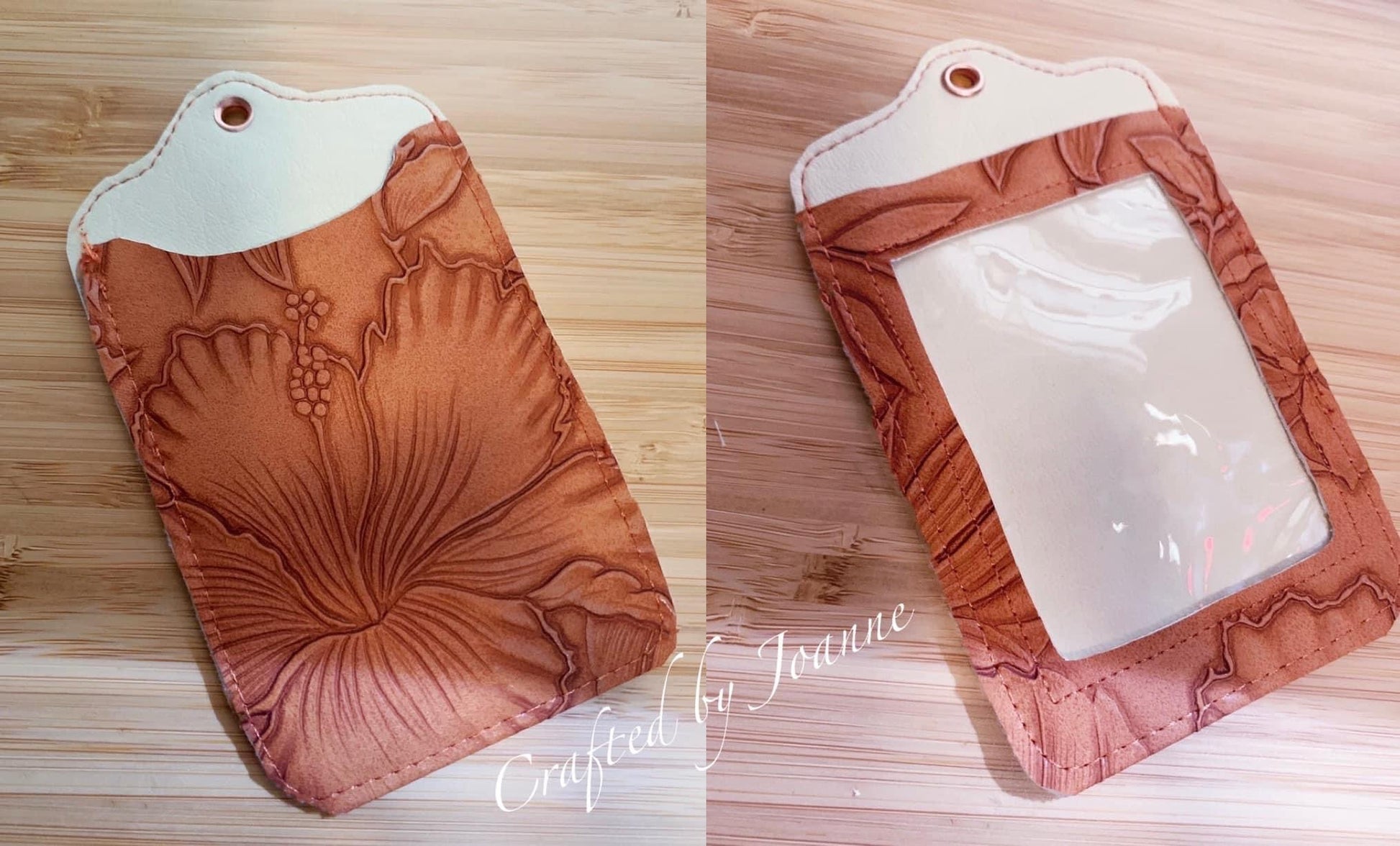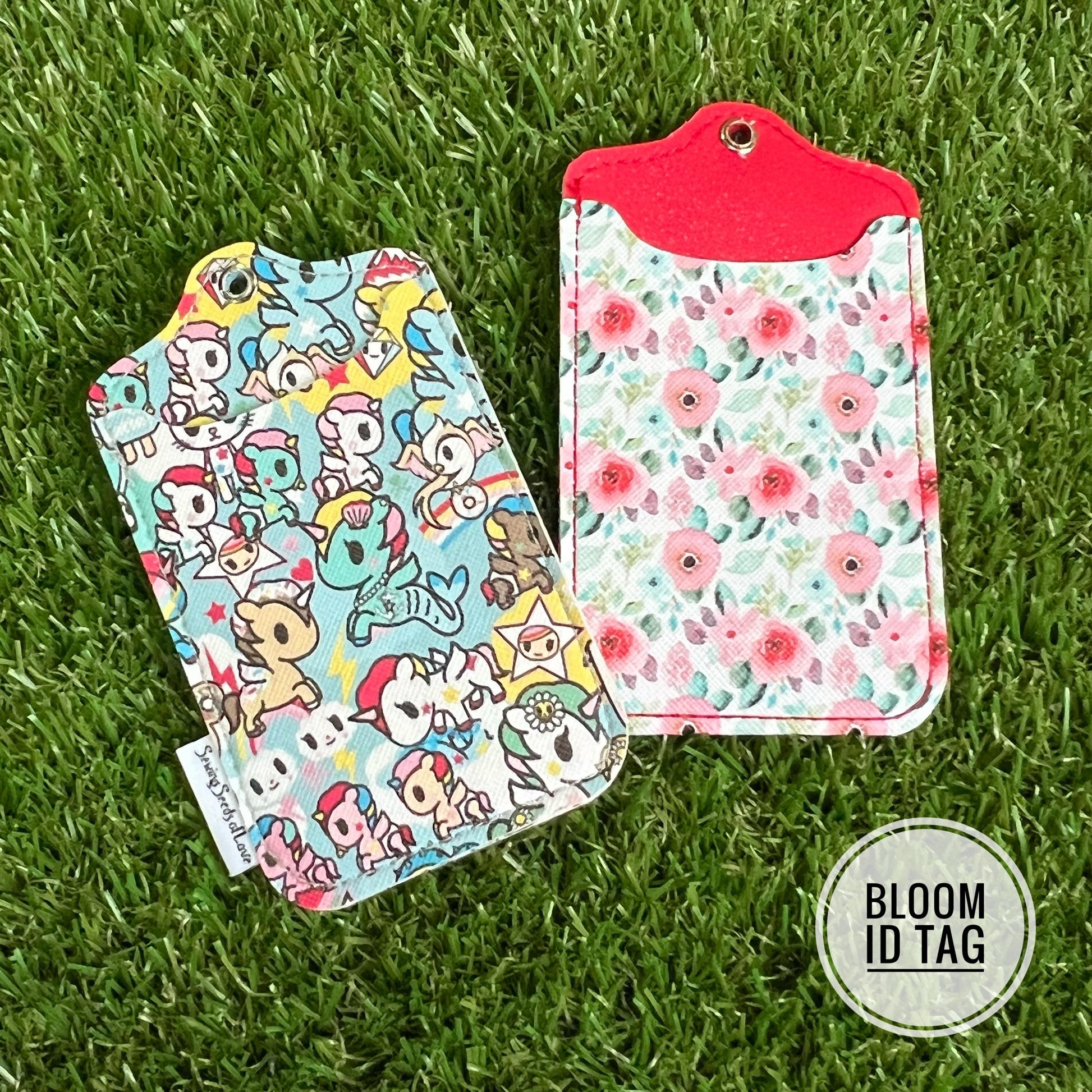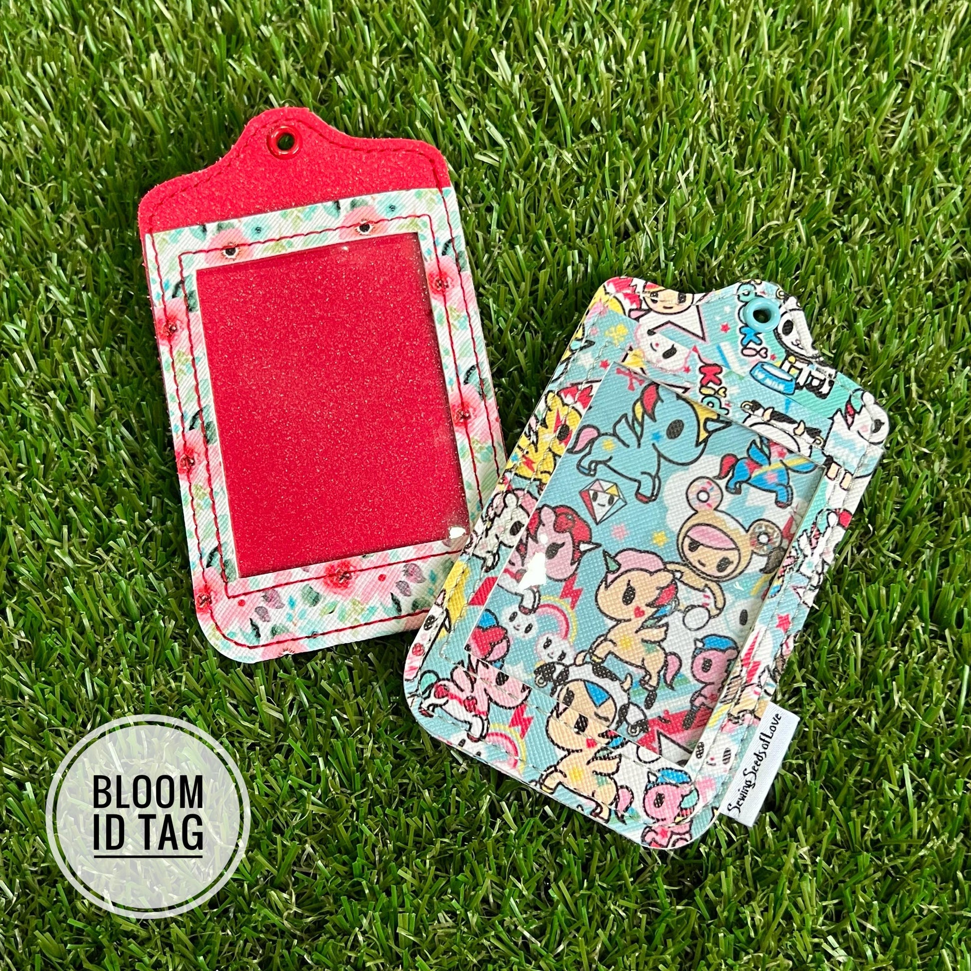 The Bloom ID Tag (a raw-edge pattern) is a basic cardholder design that will hold at least 2 cards. The front of the tag features a clear window for your ID and there is an additional card slot at the back. Add a strip of leather cording and it can be used as a luggage tag as well!