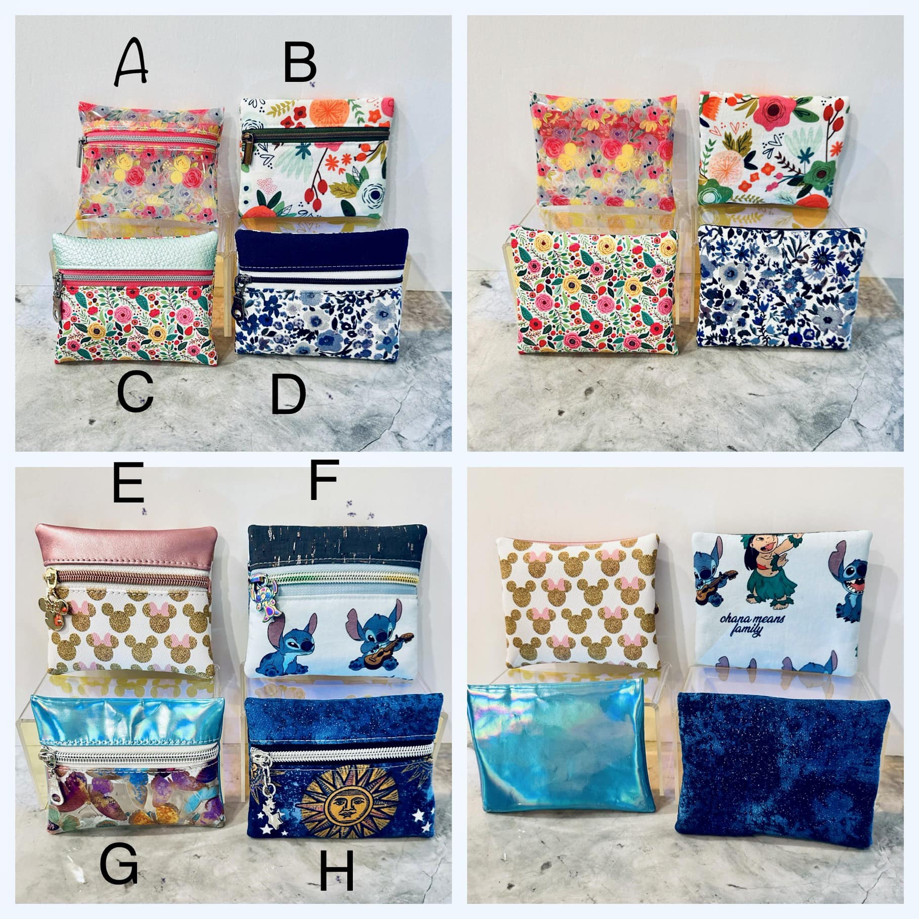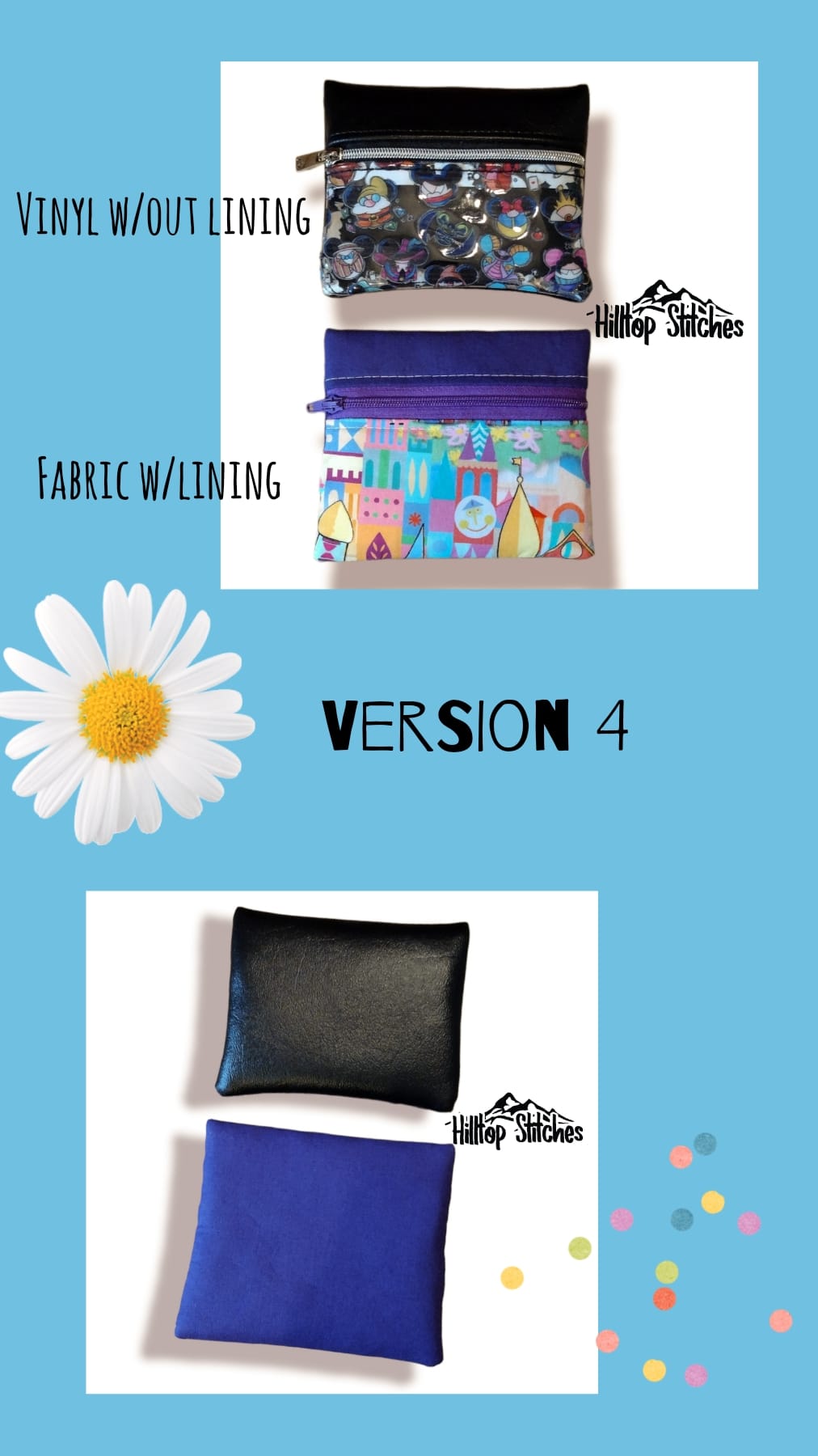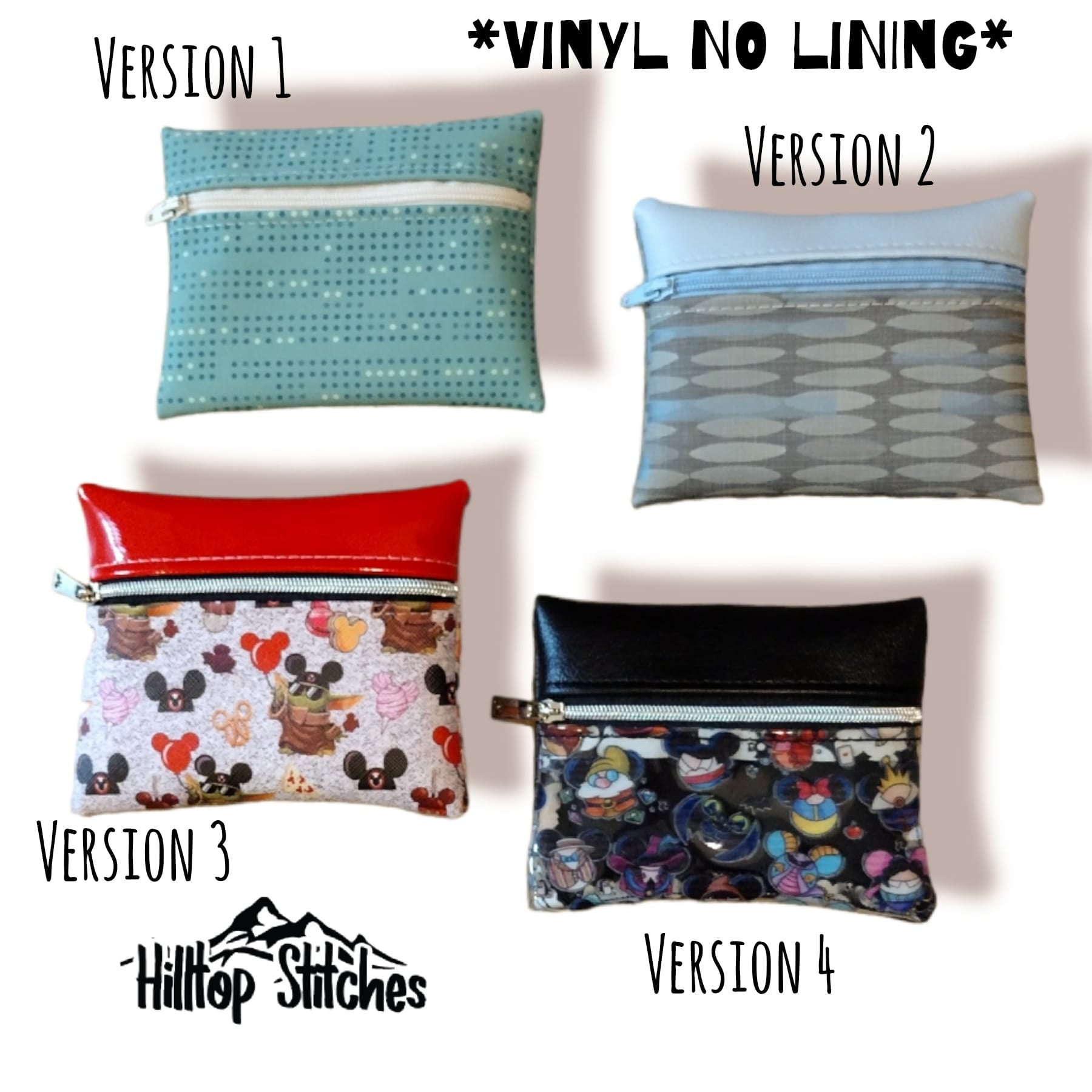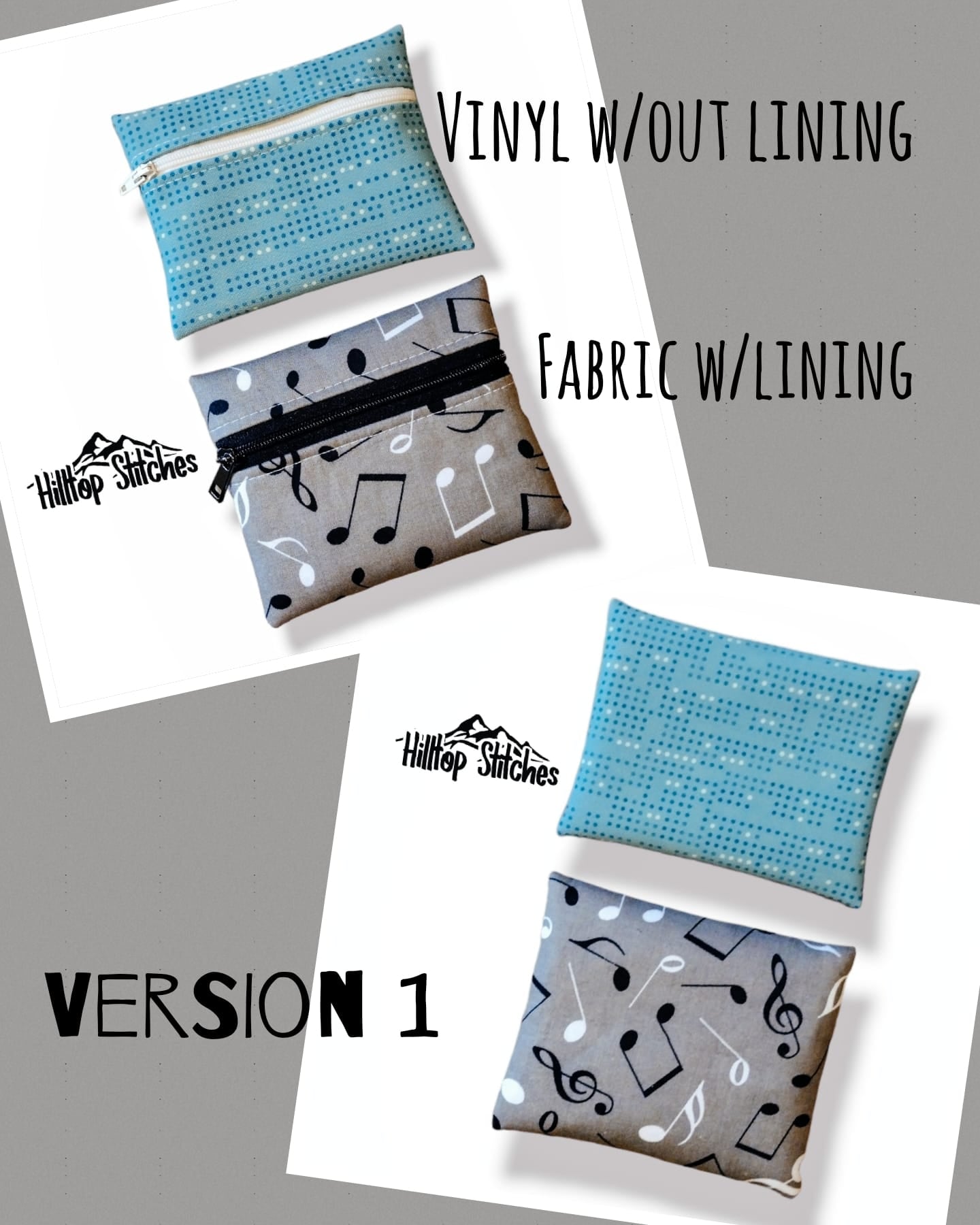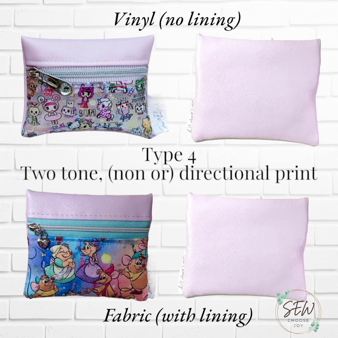 Type 4 is a two-tone look meant for directional or non-directional prints with an option to add a constrasting top accent. It has a seam along the bottom edge joining two exterior pieces together. This pattern is great for featuring a small, precious scrap of material on the front bottom piece. See clear vinyl pouch below as an example.