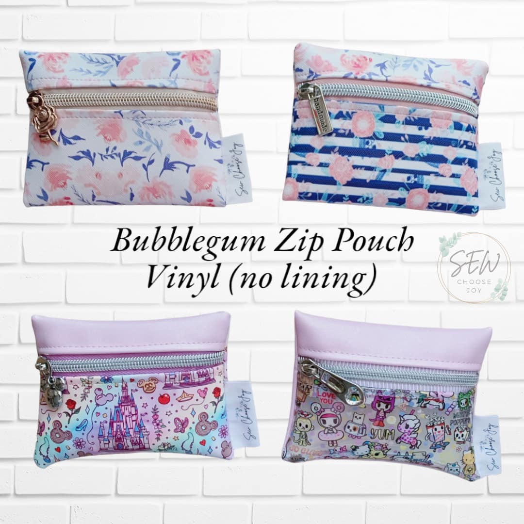 It’s STICKY! It’s SWEET! It’s the BUBBLEGUM Zip Pouch! The fastest zipper pouch I have ever whipped out, using materials such as vinyls, cork or leather (without lining). For most variations, the raw edges are tucked away out of sight, ensuring a clean finish. You could absolutely make this pouch in fabric with a lining. The raw edges are neatly concealed on the inside without serging, french seams (too thick for vinyl) or hand-sewing. This pattern shows you how to make all of the variations you could possibly play with this design. Use it for cards, coins and bits and bobs. You will be pleased to know that it will also fit the front zipper pocket of the Wanderlust Phone Bag! An excellent scrap buster and beginner-friendly craft project to batch sew for family or craft shows!