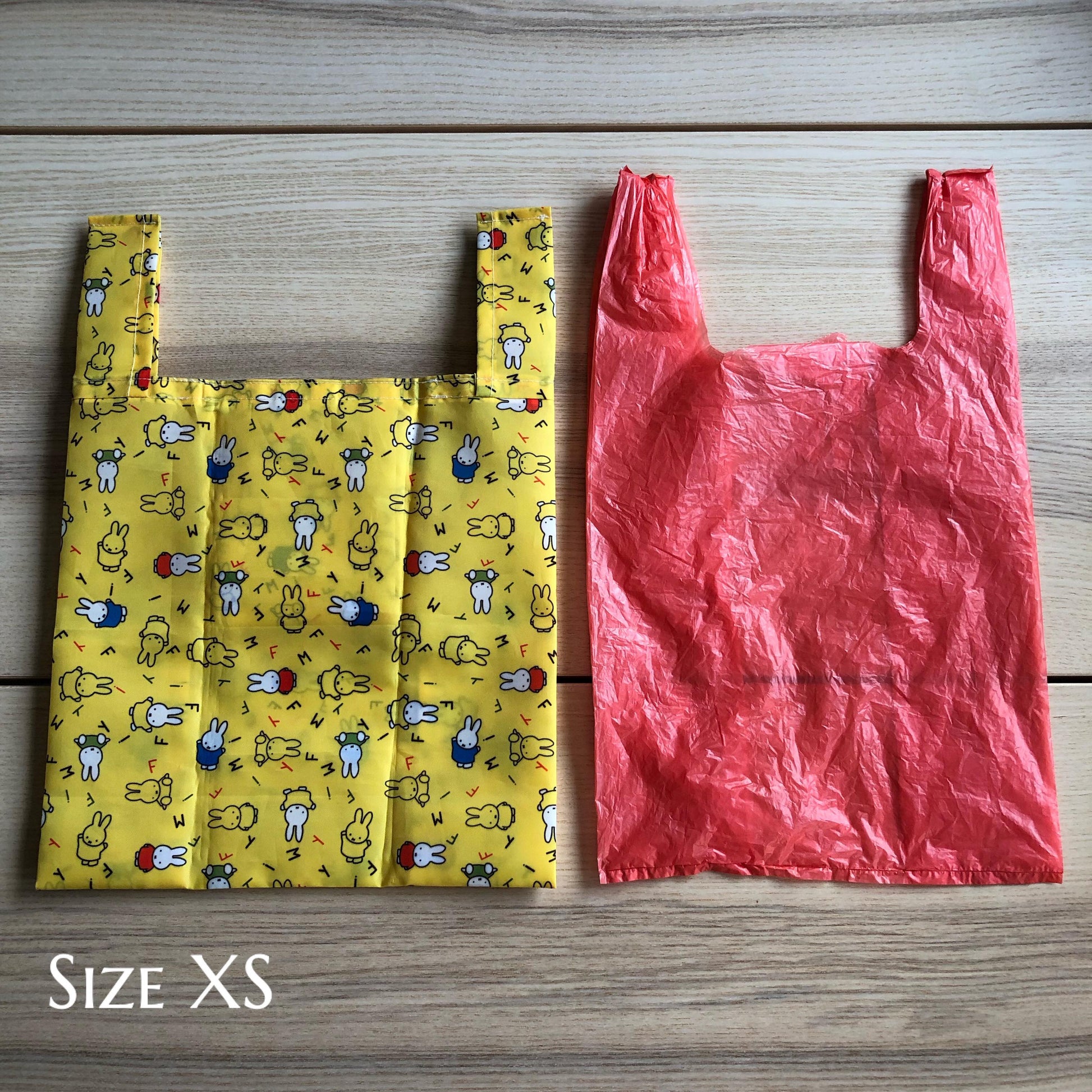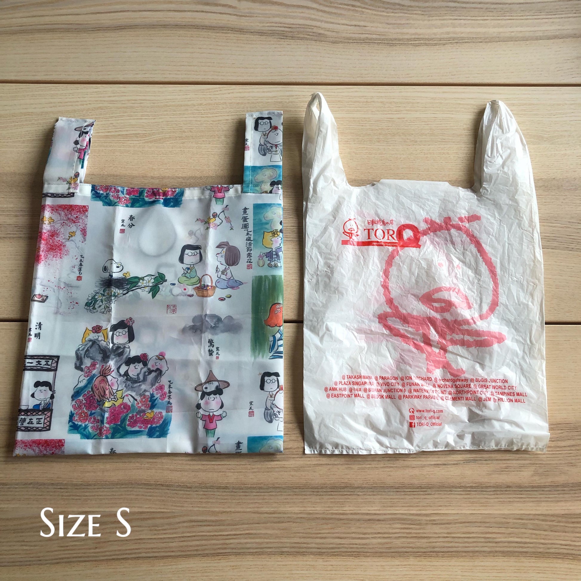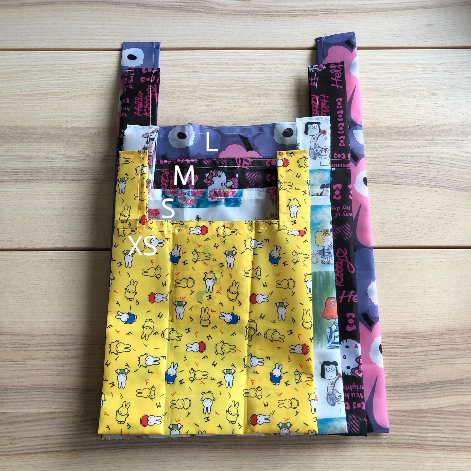 The XS, S, M and L sizes are sizes similar to the plastic bags that we typically use in our everyday life. The Bento Couple and Family sizes have got very wide bases which allow for Bento/lunch boxes to fit into comfortably without tipping over. The last size, which I termed Ramen Tower, is ideal for carrying rounded containers typically used for soups or noodles.